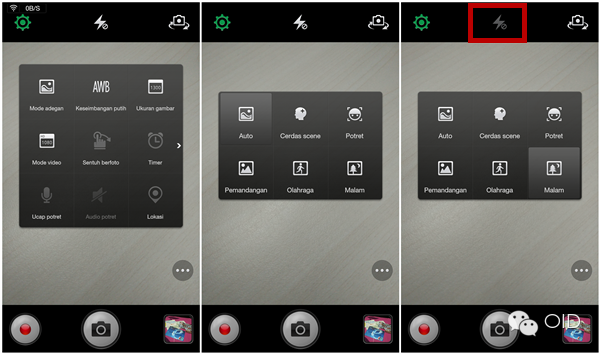 2. Pada mode adegan lain, lampu flash kamera akan aktif. Dan pada lampu flash terdapat 4 mode: aktif, mati, otomatis, dan isi cahaya.